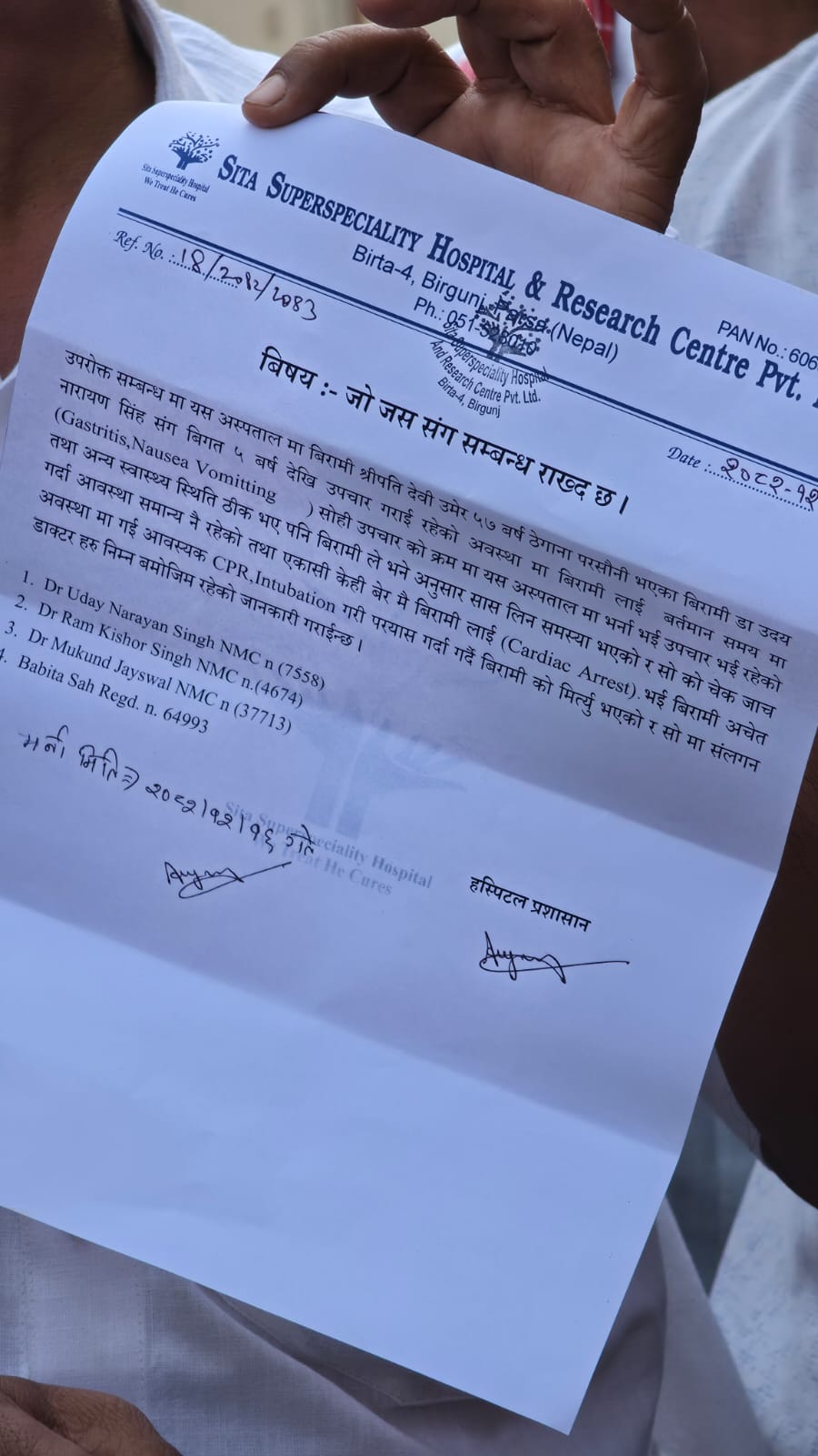 उपचारमा संलग्न चिकित्सकहरूमा डा. उदय नारायण सिंह, डा. राम किशोर सिंह र डा. मुकुन्द जैयसवाल लगायत रहेको अस्पतालले जनाएको छ। साथै, सम्पूर्ण उपचार चिकित्सकीय मापदण्डअनुसार गरिएको र कुनै लापरवाही नभएको अस्पतालको दाबी छ।