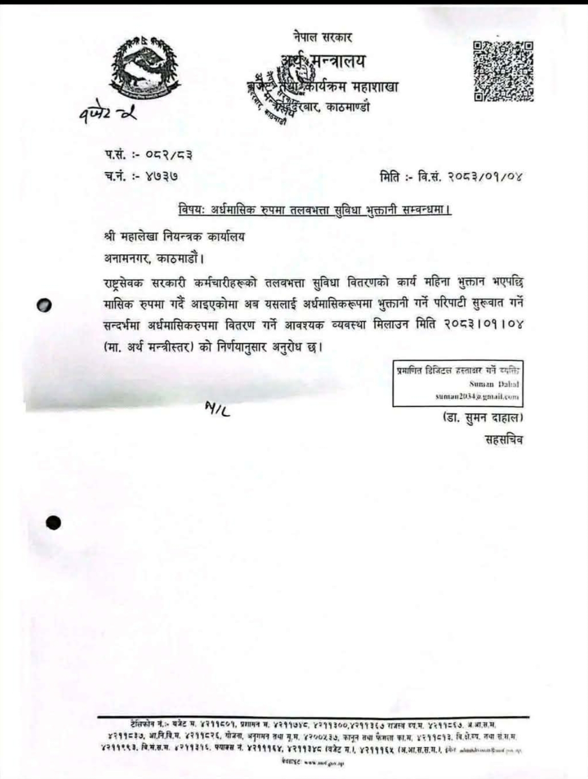 यसका लागि अर्थ मन्त्रालय ले आवश्यक व्यवस्था मिलाउन महालेखा नियन्त्रक कार्यालय लाई निर्देशन दिइसकेको छ।